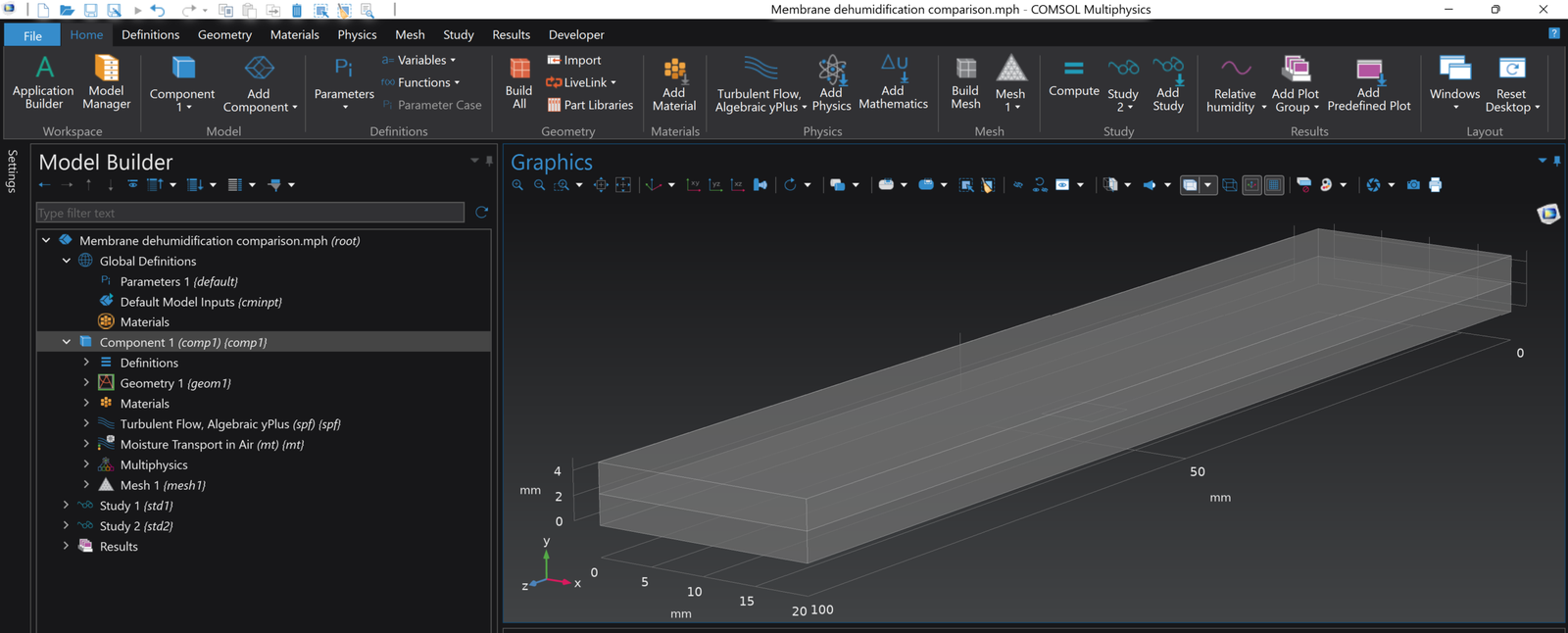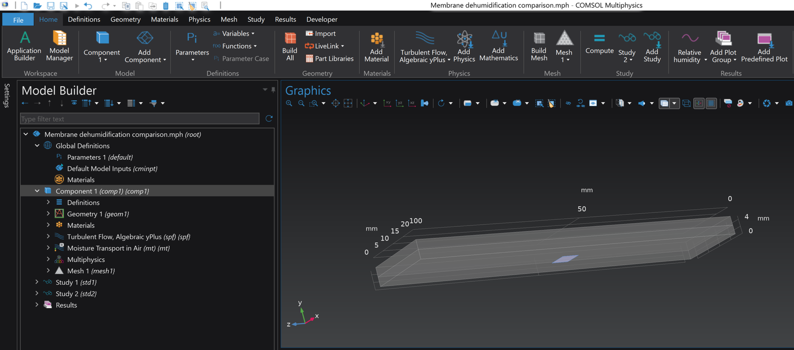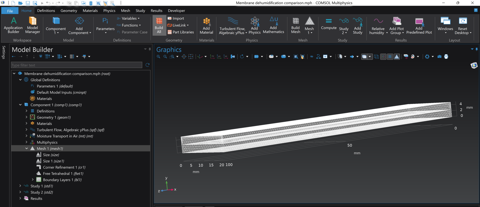 Utilizing COMSOL, we modeled turbulent fluid flow with Algebraic yPlus physics and Wall Distance Initialization, while simulating moisture content via Moisture Transport in Air. The fully coupled approach addressed grid-dependent challenges, ensuring accurate, reliable results.