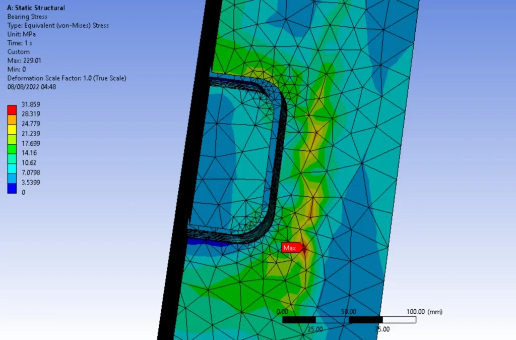 Load conditions were applied to simulate the expected operational forces acting on the joint. The system’s response was then evaluated through structural analysis to identify: