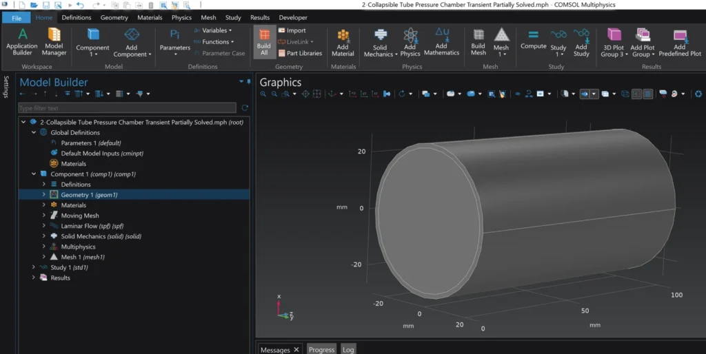 The elastic tube was assigned a constitutive material model representing its mechanical properties, ensuring that the simulation accurately captured how the structure responds to internal pressure forces.